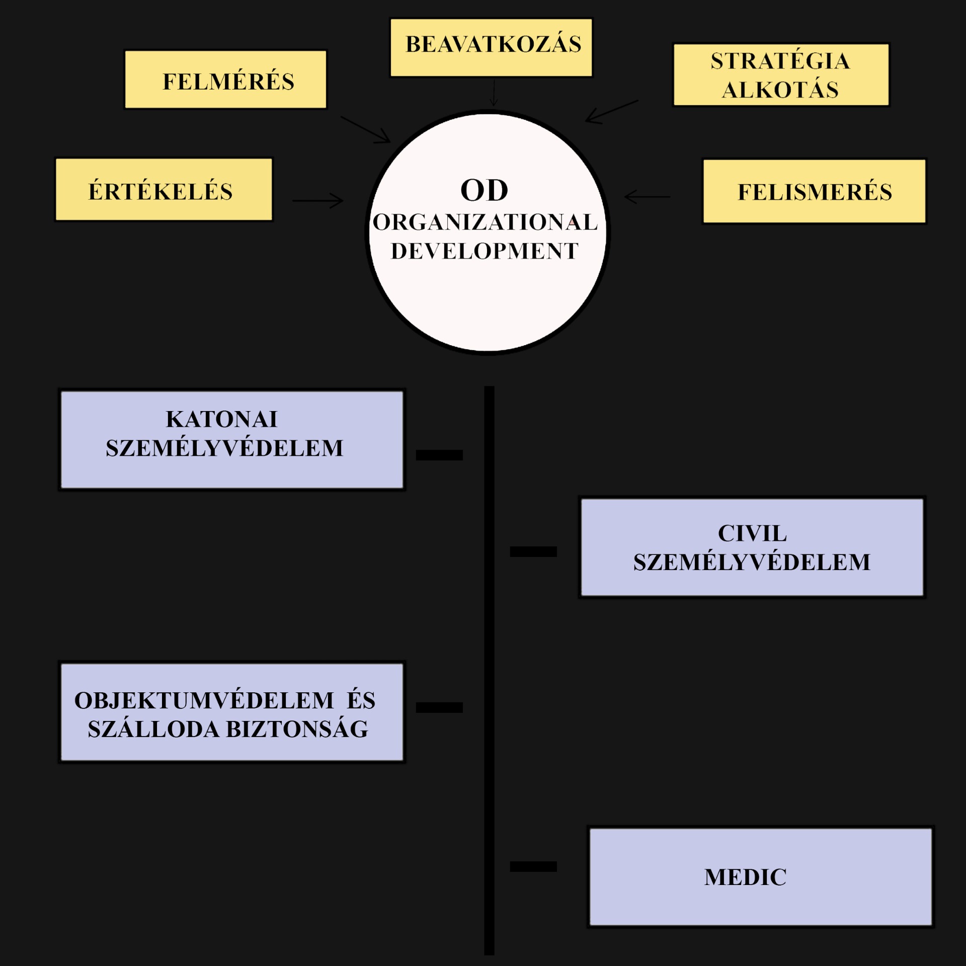 Az Organizational Development (OD) egy stratégiai megközelítés, amely a szervezet működésének, kultúrájának és teljesítményének folyamatos fejlesztését célozza. Nem egyszeri projekt, hanem ciklikusan ismétlődő folyamat: felismerés, felmérés, stratégiaalkotás, beavatkozás, értékelés. Az MTBSZSZ-ben az OD biztosítja, hogy a képzési modulok naprakészek legyenek; a tagok kompetenciái megfeleljenek a nemzetközi standardoknak; és a működési protokollok folyamatosan frissüljenek. Példák: új fenyegetéstípus (pl. drónok illegális használata) felismerése; országos felmérés a Medic modulok tömeges sérültes kezelésének erősítésére; pilot programok bevezetése a teljes körű alkalmazás előtt; a vizsgaeredmények és visszajelzések alapján történő finomhangolás. Az OD megközelítést minden szakirányban és modulban alkalmazzuk: a civil személyvédelemben (évente frissített fenyegetésfelismerési protokollok), a katonai személyvédelemben (harctéri tapasztalatok beépítése), az objektumvédelemben (új technológiák integrálása), illetve a Medic modulokban (nemzetközi egészségügyi ajánlások követése).